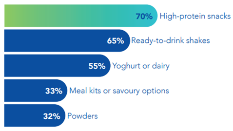 Consumers on GLP-1 therapy are starting to shun ‘empty calorie’ categories such as sugary drinks, confectionery, and sweet treats and show clear preferences for convenient, palatable, and varied protein sources, consistently identifying protein as one of the hardest nutrients to obtain from their diet, second only to vitamins. Research presented in a new global report by Carbery[vi] shows that 55% of respondents supplement with protein, of whom 70% opt for high-protein snacks such as bars and cookies, 65% take ready-to-drink shakes, and 55% consume protein-fortified yoghurt or dairy.